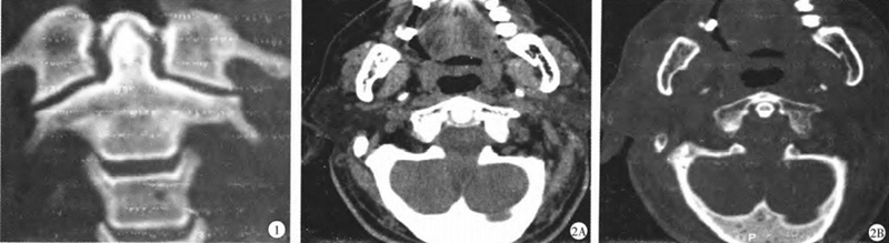 1.颈椎CT冠状面重建显示:齿状突周围韧带钙化,“晕圈样征象”2.颈椎CT横断面显示齿状突后方韧带钙化(A软组织窗;B骨窗)