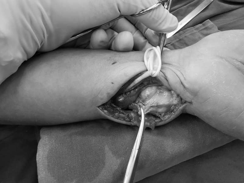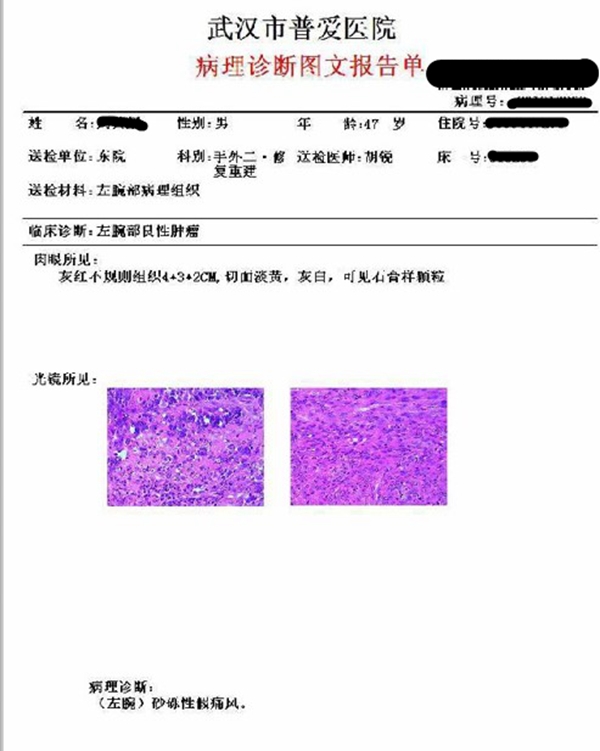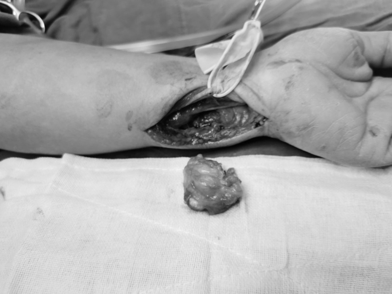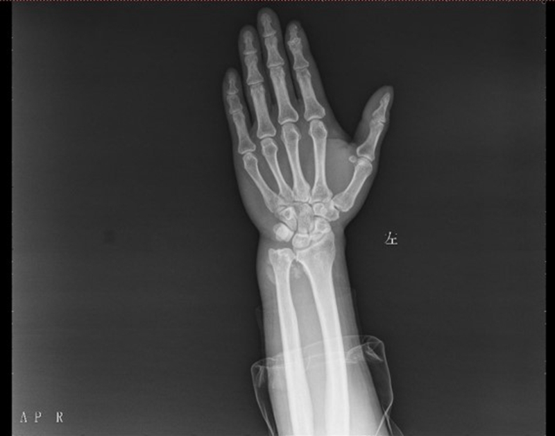 患者周X,男,47岁,发现左腕部包块1年余入院,入院查体:左腕尺侧肿胀明显,可及一质软包块,呈类圆形,可推动,左小指、无名指感觉减退,活动无受限,左手其余指感觉、活动无异常,既往体健,否认高血压、糖尿病病史,无手术史,无药物、食物过敏史