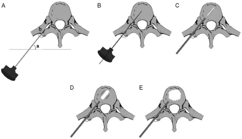 胸椎椎弓根外入路从肋横突关节b处进入,角度更倾斜a=45°。皮肤定位不是常规的横突尖部体表投影,而要更加靠外。我的方法是棘突旁2指。
