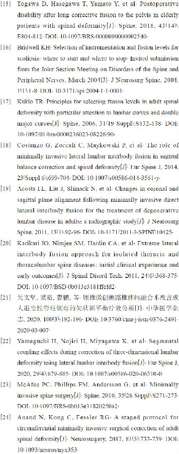 对于退变性脊柱侧凸手术固定融合范围尚未有一个完全统一的标准,理论上说LLIF/OLIF术后脊柱的冠状面和矢状面平衡发生了改变,那么所需要固定的范围也应该有所调整。Uribe等[4]通过匹配队列研究比较分析微创手术和开放手术,研究发现微创组固定融合节段较短,椎间融合节段较多,但微创组和开放组术后功能评分和再手术率相似,从而得出结论,微创手术可能缩短固定融合的范围。但是目前没有研究直接评估微创手术尤其是腰椎侧路椎体间融合术是否可以减少退变性脊柱侧凸的固定节段。