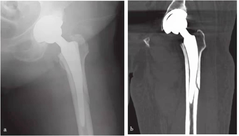 a. X线片;b. CT冠状位重建,示左侧假体柄远端附近股骨干骨折