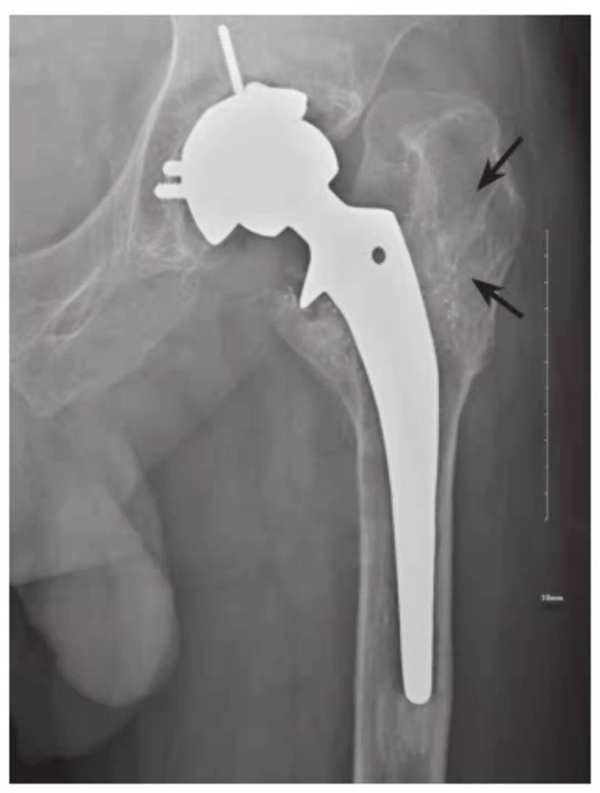 X线片,示左侧人工股骨柄近端外侧可见假体磨损碎屑(黑箭),同时柄部周围骨质吸收溶解
