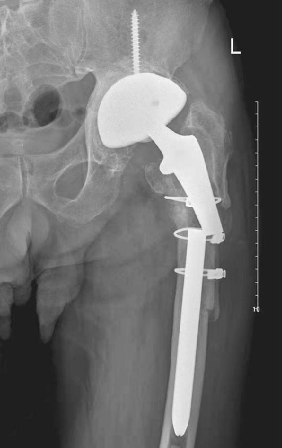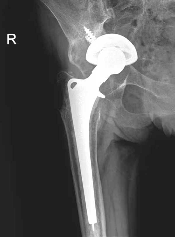 女性,89岁。发现右大腿中段后侧流脓2个月余。平片,示右股骨上段骨密度增高,内侧骨膜增生,假体周围骨质吸收,髋臼杯内陷,人工股骨柄部内移