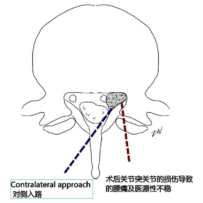 临床中经常会遇到椎间盘脱出髓核游离的病例,髓核组织向上方游离或者向下方脱垂。选择症状同侧入路的话,必然会做很多bonework,很容易造成术后腰痛及医源性不稳。对于上腰椎来说做大范围的椎板切除可能导致峡部断裂。