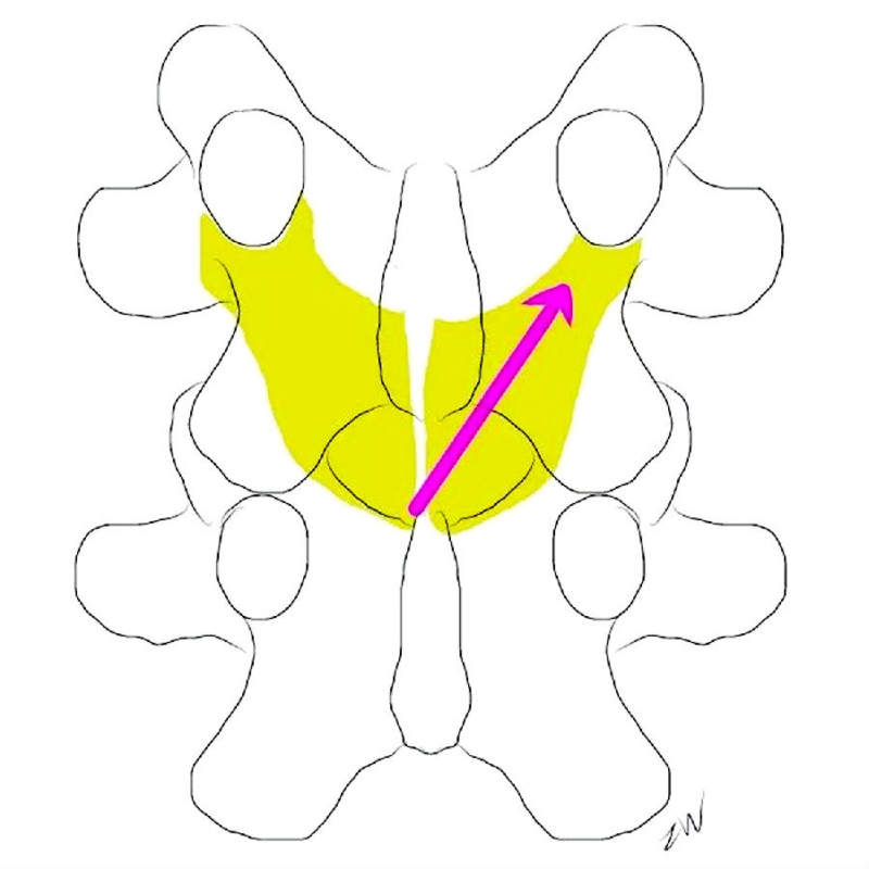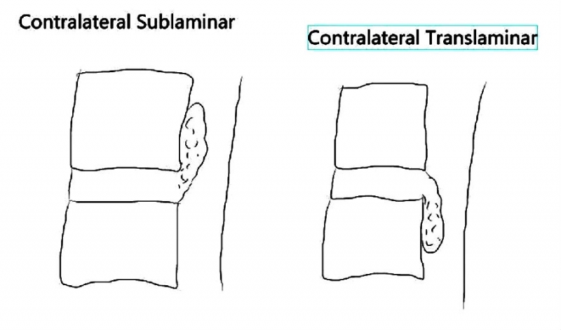 对于UBE技术而言,人们设计了对侧入路(contralateral approach)。对侧入路包括:sublaminar approach及translaminar apporach,临床可根据髓核脱出的方向选择相应的入路。