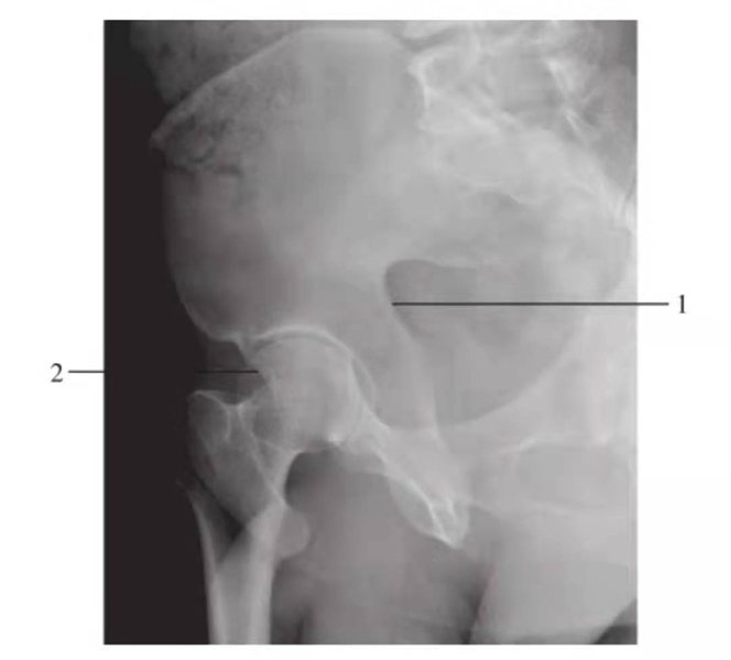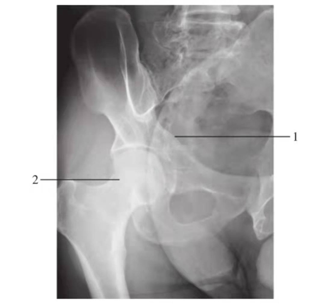 1.髂骨;2.关节间隙;3.股骨头;4.股骨颈;5.大转子