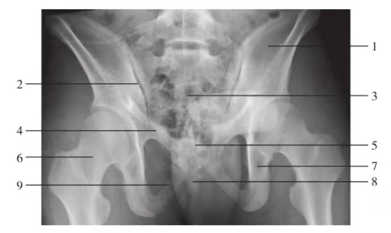1.髂骨翼;2.骶髂关节;3.骶骨;4.耻骨上支;5.耻骨联合;6.股骨颈;7.坐骨支;8.尾骨;9.耻骨下支