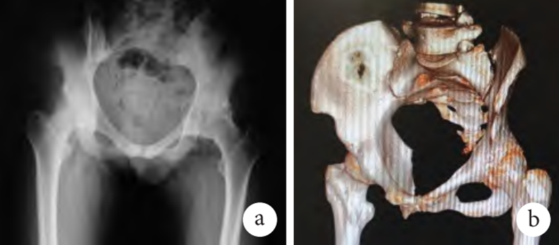 图1 a.术前骨盆X线片;b.术前髋关节CT三维重建