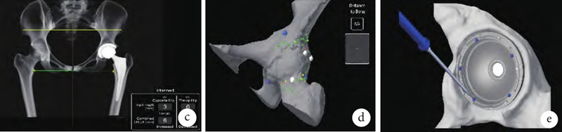 图2 c.术前假体规划;d.术中髋关节位置注册和验证;e.术中确认髋臼假体角度