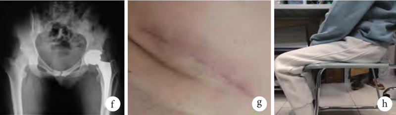 术后常规抗凝、抗感染、多模式镇痛治疗。术后体位无特殊要求,第1天在医生指导下用助行器行走,并辅以踝泵运动和股四头肌肌力练习;早期在疼痛耐受下做屈伸练习;6周改用单拐或手杖辅助行走,3个月开始无辅助行走。术后未出现切口感染、下肢深静脉血栓形成和假体松动等并发症;术后6个月随访时左髋轻微疼痛,VAS 评分 1 分,屈伸活动度0°~90°,内旋15°,外旋20°,内收10°,外展30°。术后3个月X线片示髋臼外展40°,前倾15°,下肢长度较健侧增加3mm,联合偏心距较健侧相差6mm。术后6个月,切口瘢痕反应轻(图3 g),患髋可屈曲90°(图3 f),满足坐凳子等日常生活需要;Harris评分85分,OHS评分19分,均较术前明显改善。