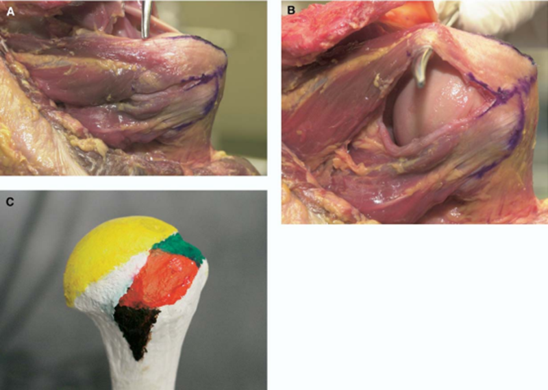 TM是最小的肌腱,附着的面积相对较大,从3点到5点呈三角形附着(图4)。平均最大长度为29mm(范围为20-40mm),平均宽度为21mm(范围为10-33mm)。附着点上部为少量腱性纤维,很快过度到下半部的单纯肌肉止点。距关节面的距离为7~20mm,平均10 mm。