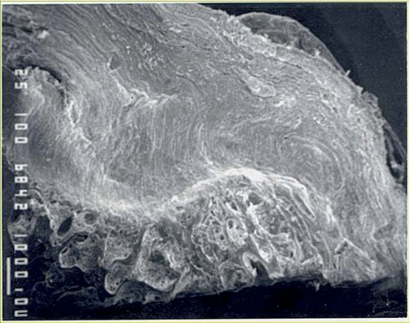 扫描电镜下可见SS肌腱与关节囊紧密粘连。附着在关节面的最边缘。附着点显示一种健性分层的外观,延伸到大结节的边缘(图6)。胶原显微结构层次分明,排列整齐。