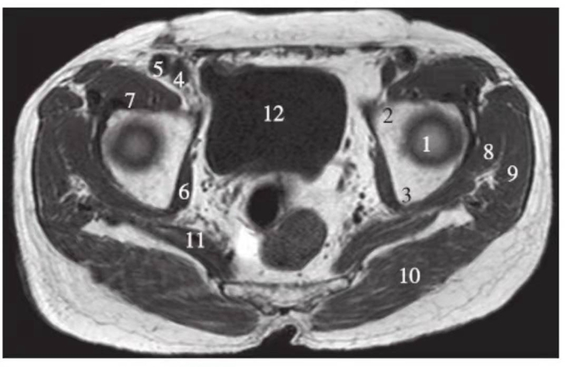 1.股骨头;2.耻骨;3.坐骨;4.股静脉;5.股动脉;6.闭孔内肌;7.髂腰肌;8.臀小肌;9.臀中肌;10.臀大肌;11.梨状肌;12.膀胱
