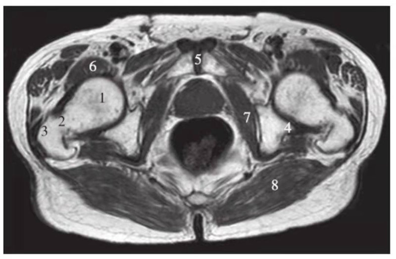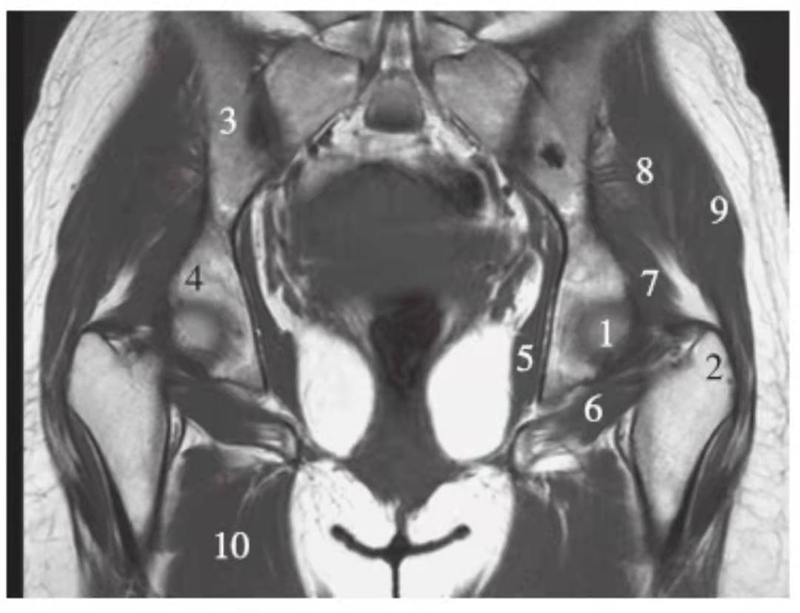 1.股骨头;2.大转子;3.髂骨;4.坐骨;5.闭孔内肌;6.闭孔外肌;7.臀小肌;8.臀中肌;9.臀大肌;10.内收肌群