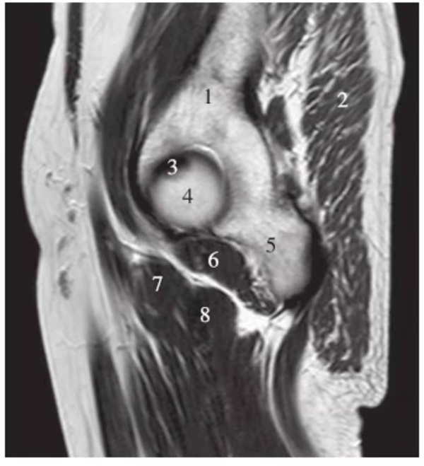 1.髂骨;2.臀大肌;3.圆韧带;4.股骨头;5.坐骨;6.闭孔外肌;7.耻骨肌;8.大收肌