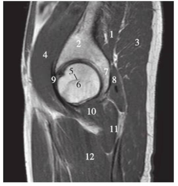 1.臀中肌;2.髂骨;3.臀大肌;4.髂腰肌;5.股骨头骺线;6.股骨头;7.髋臼后唇;8.梨状肌;9.关节囊及髂股韧带;10.闭孔内肌;11.股方肌;12.大收肌