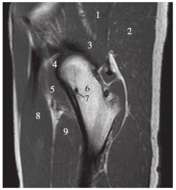 1.臀中肌;2.臀大肌;3.臀小肌;4.关节囊及髂股韧带;5.髂腰肌;6.股骨颈;7.骨岛;8.股直肌;9.股中间肌