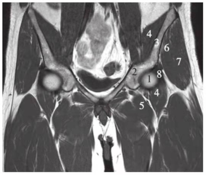 1.股骨头;2.耻骨;3.髂骨;4.髂腰肌;5.内收肌群;6.臀小肌;7.臀中肌;8.关节囊及髂股韧带