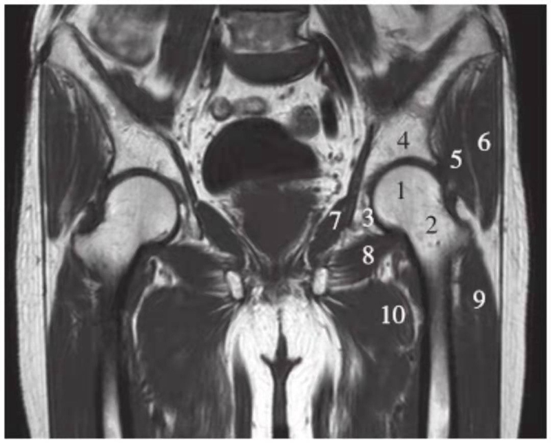 1.股骨头;2.股骨颈;3.髋臼窝内脂肪;4.髂骨;5.臀小肌;6.臀中肌;7.闭孔内肌;8.闭孔外肌;9.股外侧肌;10.股内侧肌