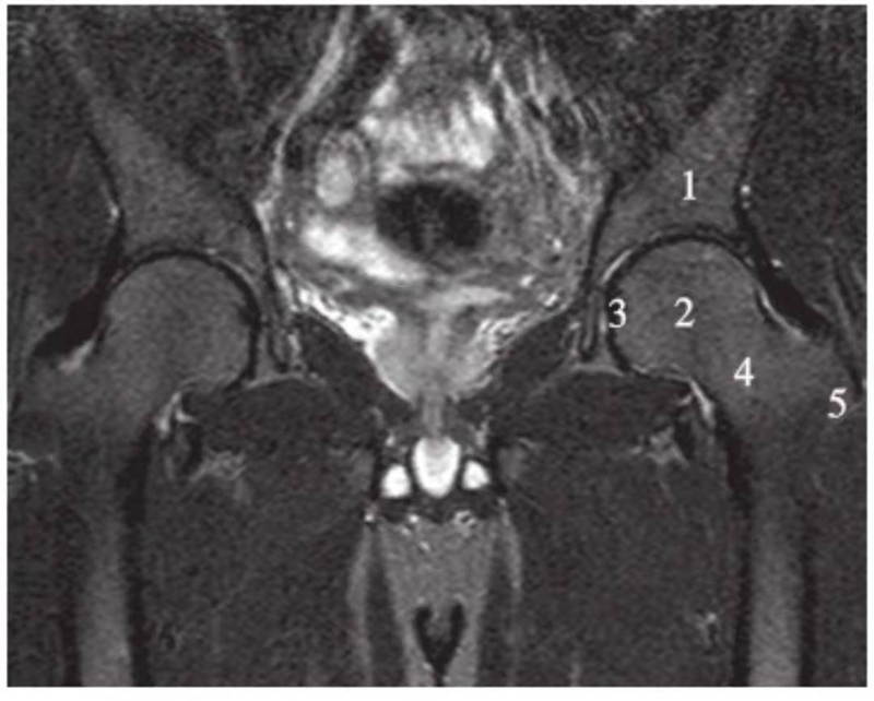 1.髂骨;2.股骨头;3.股骨头凹;4.股骨颈;5.大转子