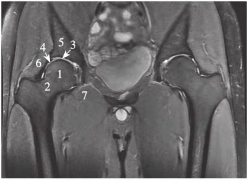 1.股骨头;2.股骨颈;3.关节软骨;4.髋臼盂唇;5.髂骨;6.臀小肌;7.闭孔外肌