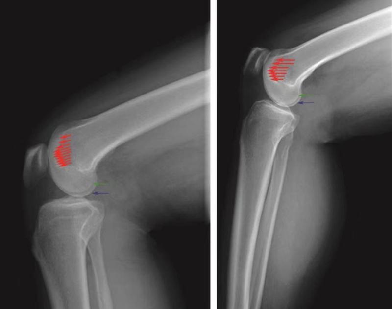 此外,部分患者的胫骨前上缘难以确定。若患者行胫骨结节转移术后,Caton指数可能无法评估。对全膝关节置换术后,也无法使用Caton指数进行评估。