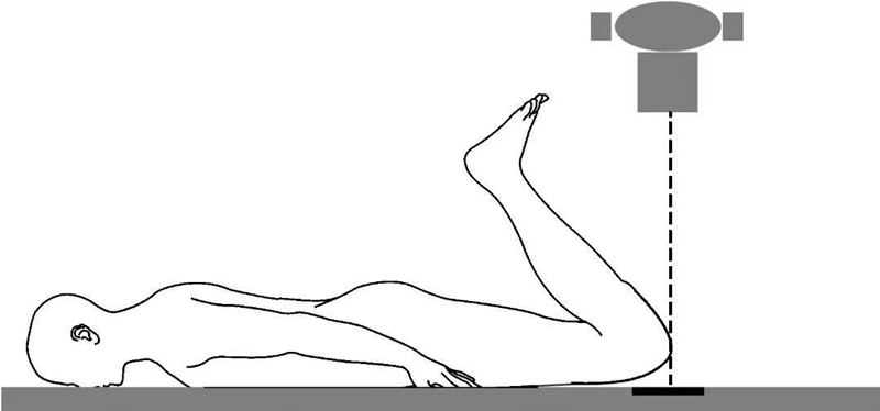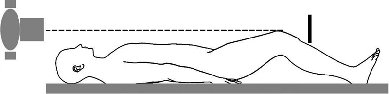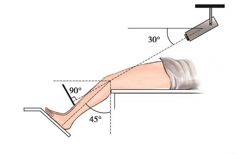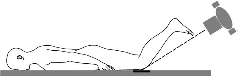 (3)Wiberg和Knutsson分别在1941年描述了一种方法,即沿相反的方向进行投照,照片盒位于胫骨前方且与X线投照方向垂直,X线沿水平方向投照(图3)。