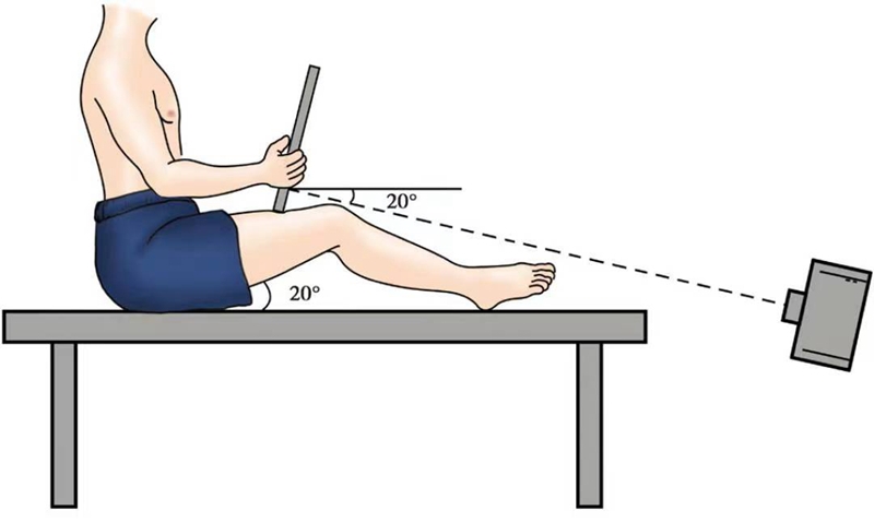 (6)Laurin位投照方法(图5):患者取坐位,膝关节屈曲20°。患者手持X线片盒,置于髌骨近端约12cm处的大腿前方,X线投照方向由足侧指向头侧,低于水平面20°。这种方法实施起来比较困难且需要放射技师的详细指导,但它却有助于发现更细微的髌骨轨迹异常以及更为严重的髌骨倾斜、脱位及半脱位。