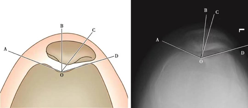股骨滑车沟角(∠AOD)即股骨滑车内外侧关节面的最高点与滑车切迹最低点连线所构成的夹角。正常值为138°±6°,大于此值提示股骨滑车关节面发育不良。