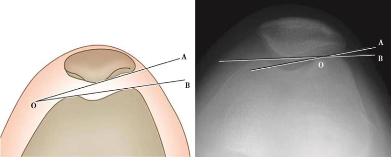 外侧髌股角(∠AOB)即股骨内外髁最高点连线与髌骨外侧关节面两缘连线所构成的夹角。Laurin等提出:外侧髌股角是诊断髌骨倾斜的标准。尽管外侧髌股角被用于评估髌骨半脱位,但它最适合的用途是评估髌骨倾斜。正常者此角应向外张开,若开口向内或消失则提示髌骨倾斜或(和)髌骨外侧半脱位。