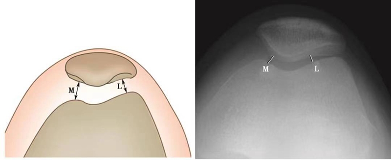 髌股指数即髌骨-股骨内侧关节面间隙的最小间距(M)与髌骨-股骨外侧关节面间隙最小间距的比值(L)。正常情况下此值应<1.6,若髌股指数>1.6提示髌骨倾斜或(和)髌骨外侧半脱位。