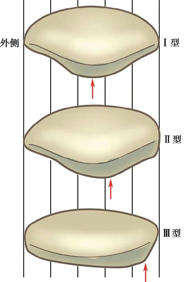 图9 Wiberg分型示意图(红色箭头为WibergⅠ、Ⅱ、Ⅲ型的髌骨嵴所在位置)