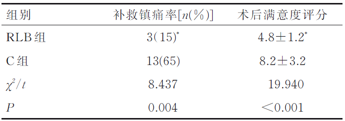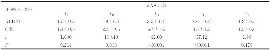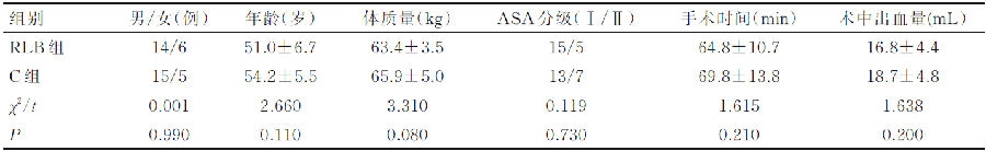 RLB组由麻醉医师在超声引导下在脊柱旁矢状位平面内行椎板后阻滞,C组由手术医师根据手术定位逐层局部浸润麻醉,所用药物均为0.5%罗哌卡因20mL。