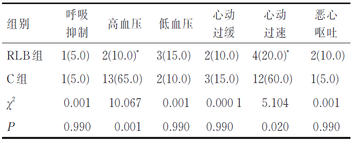 两组患者均未观察到麻醉后影响下肢运动功能的情况和阻滞操作相关不良反应及并发症(如局麻药误入椎管内、局麻药物中毒、局部血肿等),RLB组患者术中高血压和心动过速的发生率低于C组(P<0.05),两组患者术中呼吸抑制、低血压、心动过缓和恶心呕吐的发生率差异无统计学意义(P>0.05,表4)。