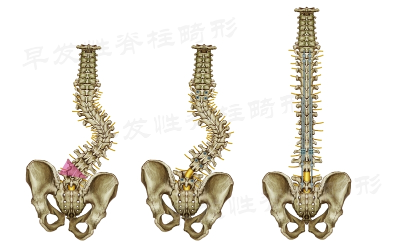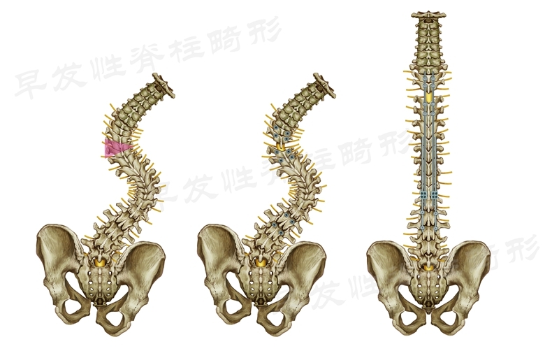 对于累及范围短的畸形,可通过骨骺阻滞、截骨短节段融合等手术来治疗,短节段融合对患儿脊柱以及胸廓生长的影响很小。对于累及范围长的畸形来说,早期融合会导致短躯干以及胸廓发育不良综合征,因此对于此类患者,应当使用非融合技术。