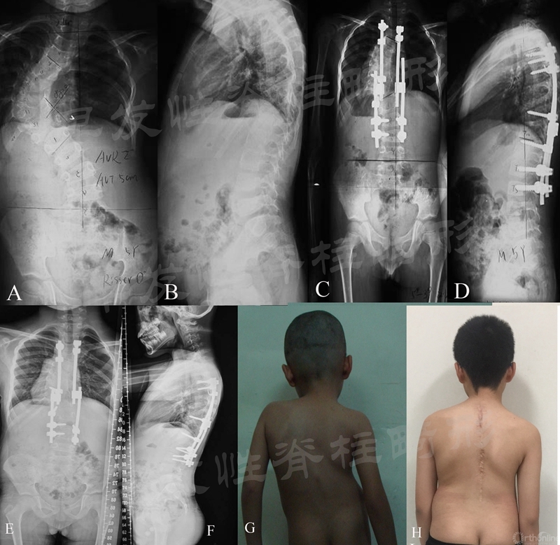 图5 患儿,男性,6岁。A、B、G.严重先天性脊柱侧凸;C、D.行顶椎区截骨短节段融合以及双生长棒矫形;E~H.术后5年随访矫形满意,脊柱明显生长,胸廓发育良好