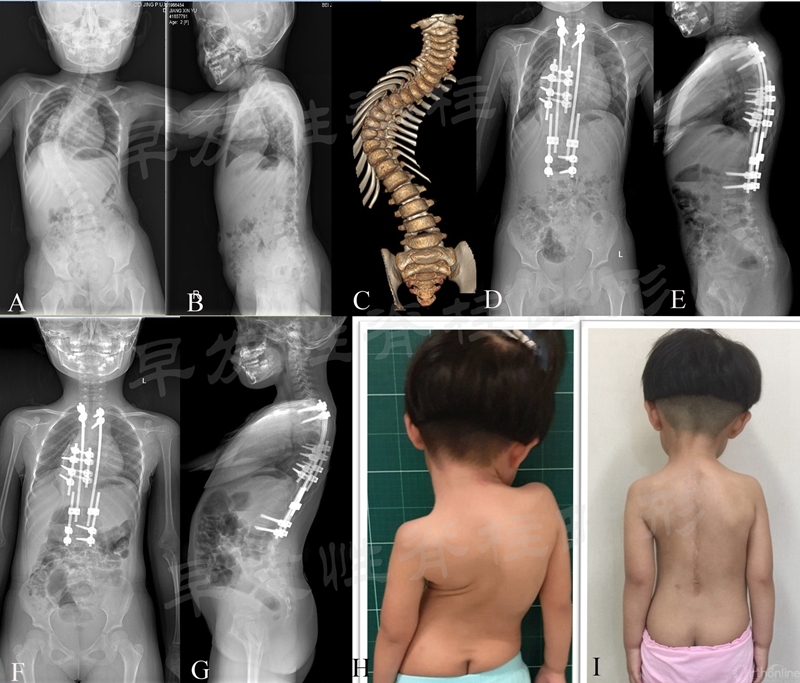 图6 患儿,女性,4岁。A~C、H.严重先天性脊柱侧凸;D、E.行顶椎区截骨短节段融合以及双生长棒矫形;F~I.术后3年随访矫形满意,脊柱明显生长,胸廓发育良好