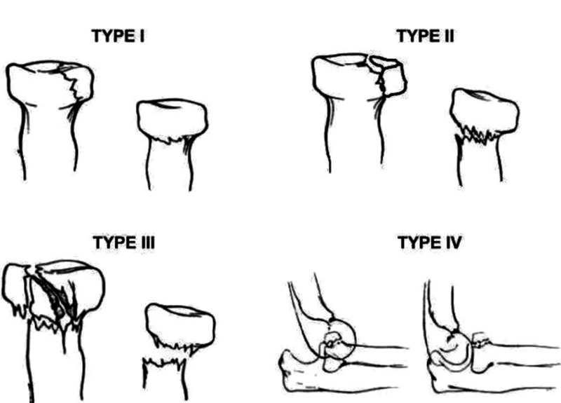 ①桡骨头前半球骨折;②桡骨头后半球骨折。
