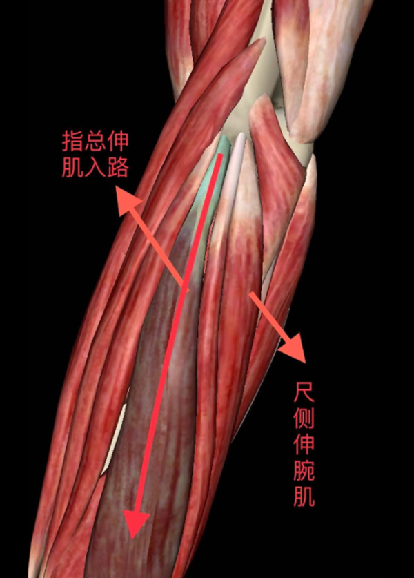 起自肱骨外上髁后侧,沿伸肌群后缘向远侧延长4~5cm至尺骨上端外侧缘。(斜向尺骨后侧,止于鹰嘴尖下方6cm处)。自尺侧伸腕肌与肘肌间隙分离。肘肌向尺侧,尺侧伸腕肌向桡侧牵开。