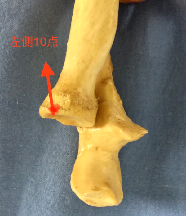 3、依据赤道线分型提出“桡骨头安全区”概念,即前臂旋转中立位时,桡骨头横切面10点(左侧10点,右侧2点)为中心的110°弧形范围为钢板放置相对安全区。此区域关节软骨覆盖率较低,且在旋转时不会撞击尺骨的桡骨切迹,适合于放置内固定。