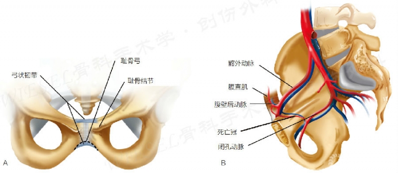 图1 A.骨盆前面观,显示两侧耻骨之间的纤维软骨盘,上、下弓状韧带,以及耻骨联合和耻骨结节之间的关系。B.死亡冠在耻骨上支的内侧面,距耻骨联合约6cm,它是闭孔动脉和髂外动脉的吻合支