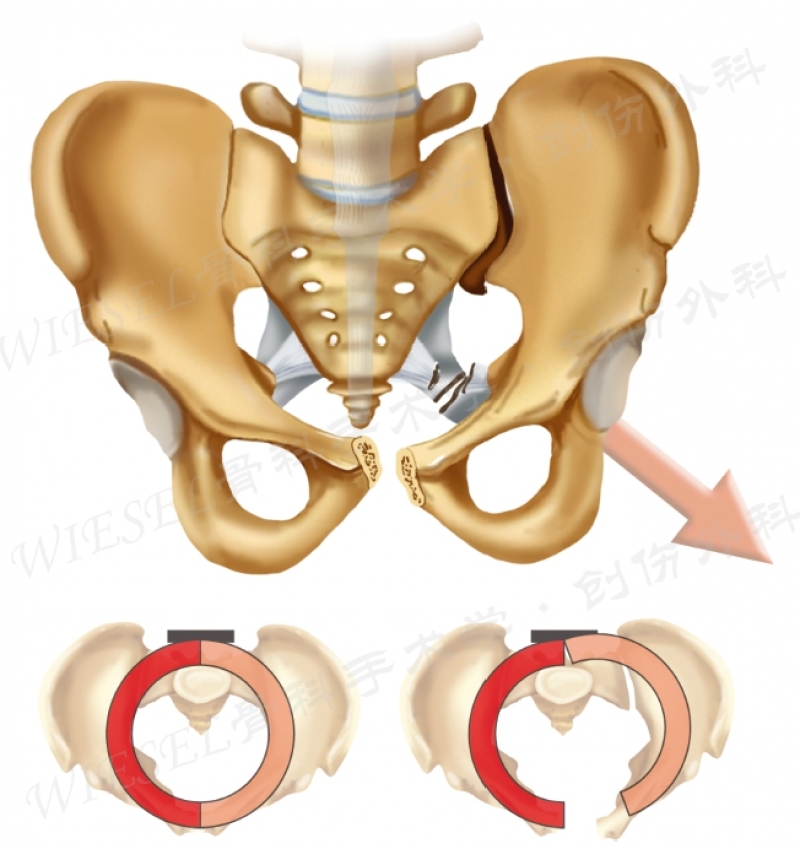 在前后挤压型损伤,耻骨联合轻度增宽可能不涉及盆底损伤,包括骶棘韧带的撕裂。在尸体上,将耻骨联合旁韧带和骶棘韧带切断,可观察到耻骨联合增宽超过2.5cm,即为旋转不稳定的骨盆。如果盆底和骶棘韧带撕裂,伤侧半骨盆可向下和外侧外旋,沿后方完整的骶髂韧带旋转,表现为不稳定骨盆(图3)。
