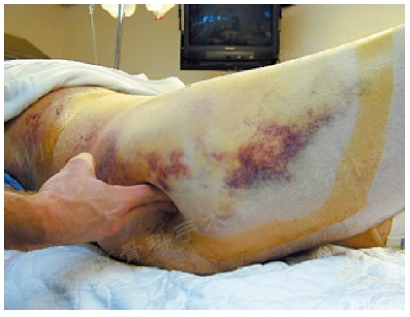 侧骨盆稳定性。还需要仔细检查皮肤有无瘀斑和血肿形成,特别是在臀部、腹股沟和腹部。骨盆周围皮下和筋膜剥脱(Morel-Lavallée损伤),提示骨盆区发生了高能量损伤(图4)。发现这一损伤对预防感染很重要,在耻骨联合最终固定前可能要行手术解压。