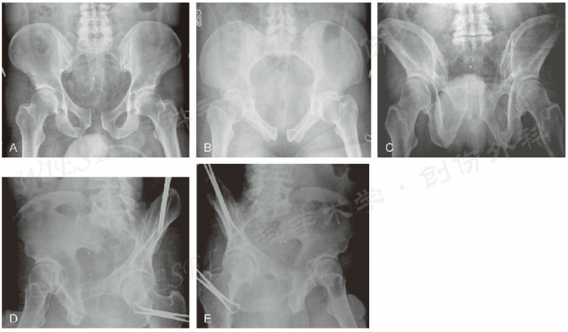 图5 A~E.一例骨盆创伤、耻骨联合增宽患者的骨盆前后位(A)、入口位(B)、出口位(C) 以及Judet位(D、E)影像(经允许引自Jodi Siegel,MD&David Templeman,MD)
