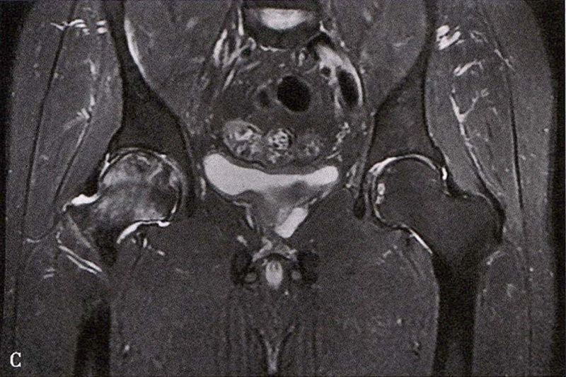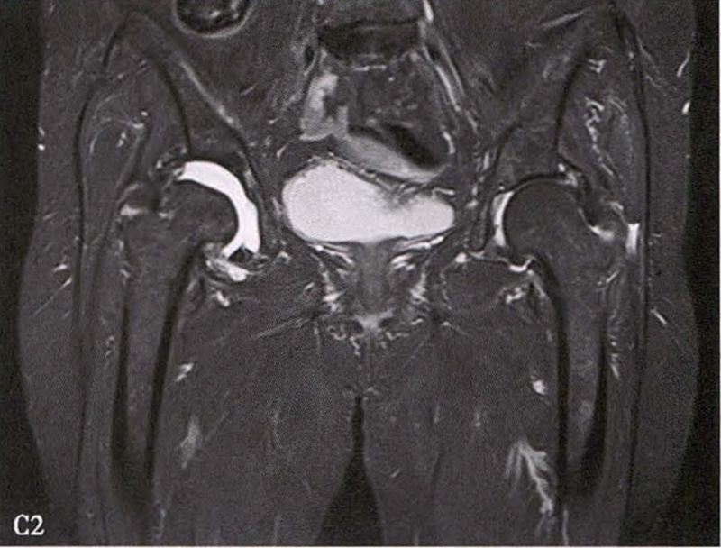 C.女性,89岁,右侧股骨头坏死Ⅳ期。X线片示右侧股骨头压缩变扁,右侧髂臼密度增高,关节内侧间隙狭窄、不均匀(C1)。MRI示右股骨头压缩变扁,右髋关节腔比较多积液(C2)。