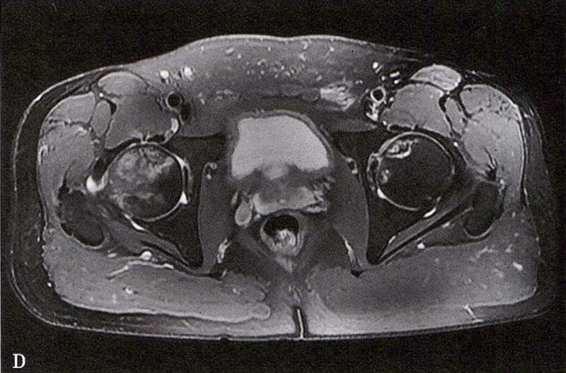 MRI示双侧股骨头坏死,冠状面显示右侧股骨头坏死(图A、C),横断面显示双侧股骨头坏死(图B、D);T1加权像(图A、B)显示硬化带为低信号,T2加权像(图C、D)显示右侧骨坏死硬化带外围高信号的骨髓水肿,左侧无骨髓水肿。