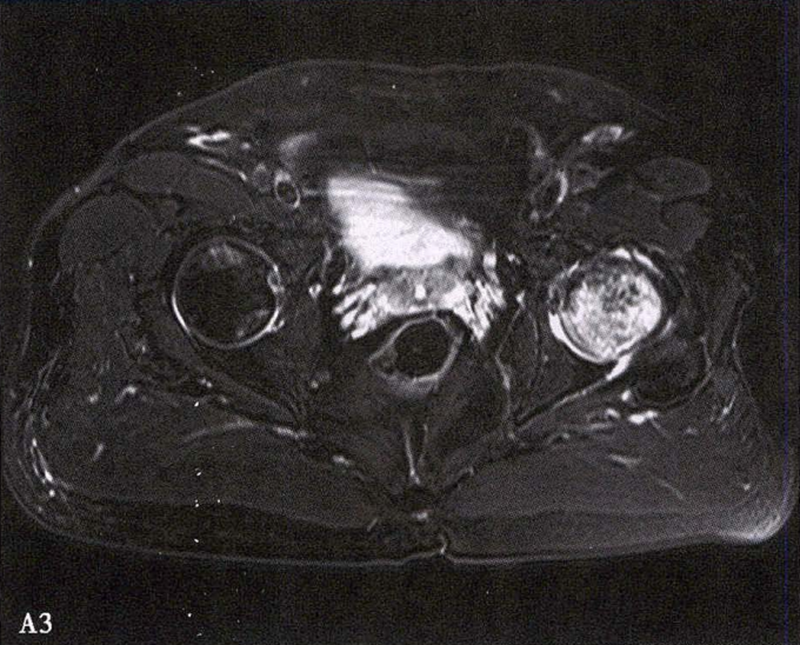 A.男性,71岁,双侧股骨头坏死,右侧Ⅰ期、左侧Ⅲ期。X线片示双侧股骨头形态可,右股骨头未见明显密度改变,左股骨头关节面下见局限性骨密度减低及增高区(A1)。MRI(T2加权像)示右股骨头内双线征,左侧不规则形混杂信号,坏死区远端骨髓水肿(A2、A3)。