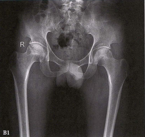 X线检查示右侧股骨头骨质密度不均匀