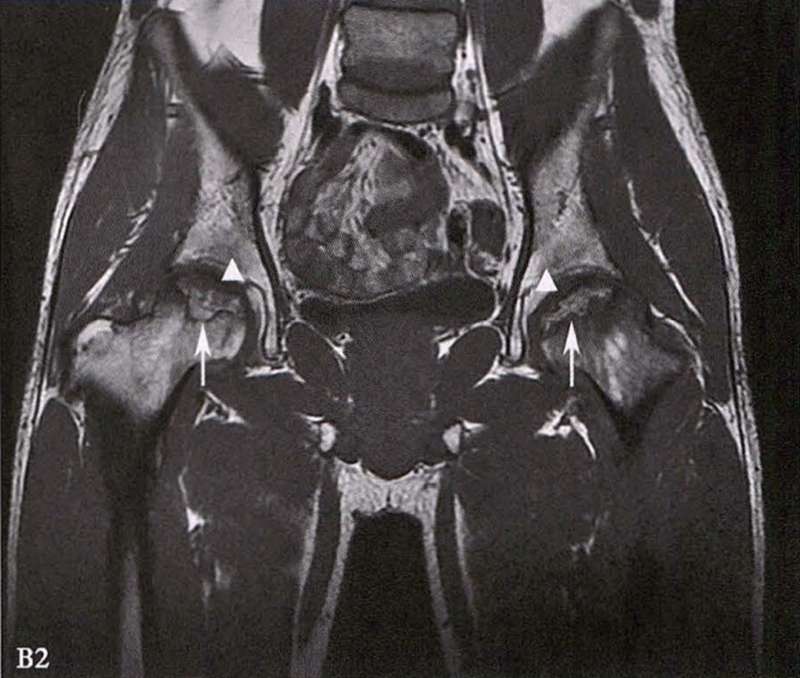 B.男性,31岁,双侧股骨头坏死,双侧均为Ⅲ期。X线片示双侧股骨头密度不均、股骨头稍变扁(B1)。MRI(T1加权像)示股骨头内多发不规则信号带(B2),股骨头内凸向大转子的双线征(白色箭)和软骨下骨骨折(白色三角)。