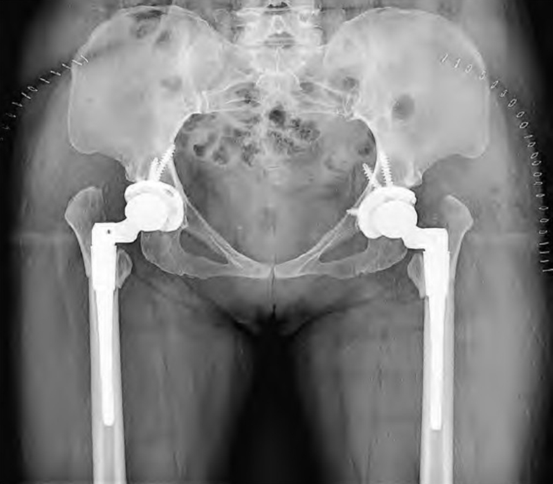 图4 双侧THA术后DR:双侧臼杯均建立在真臼位置,假体适度内移,未额外骨移植,双侧均应用44mm生物型多孔臼杯和高交联聚乙烯内衬,搭配28mm陶瓷股骨头假体。股骨侧采用可调节前倾角的组配式假体,近端和远端均获得良好固定,双侧均采用转子下斜行截骨方式,截骨处固定可靠,未加用额外固定方式,假体匹配良好,双下肢基本等长